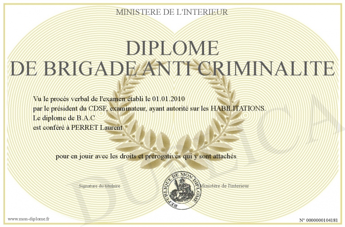 Envoyez par email votre Diplôme de brigade anti criminalite personalisé
