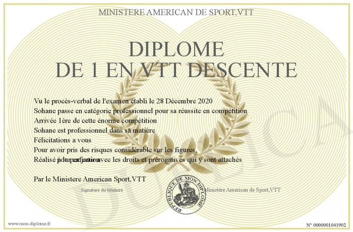 Envoyez par email votre Diplôme de 1 en VTT Descente personalisé