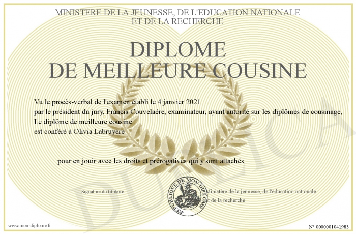 Envoyez par email votre Diplôme de meilleure cousine personalisé