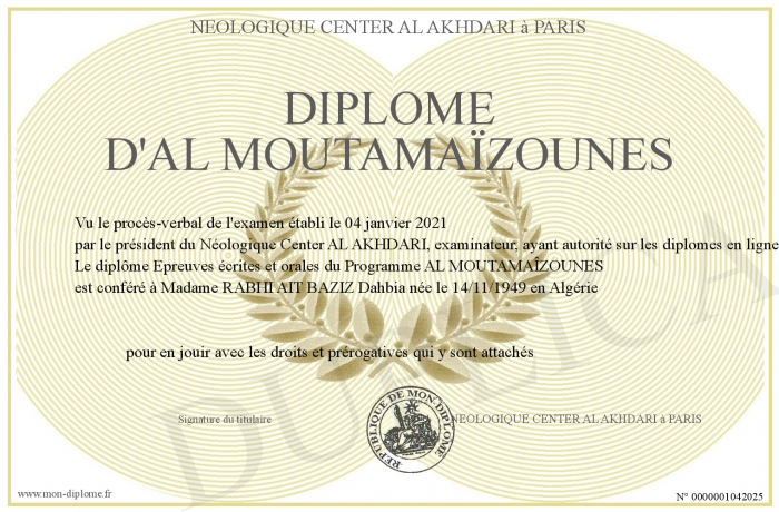Envoyez par email votre Diplôme d'AL MOUTAMAÏZOUNES personalisé