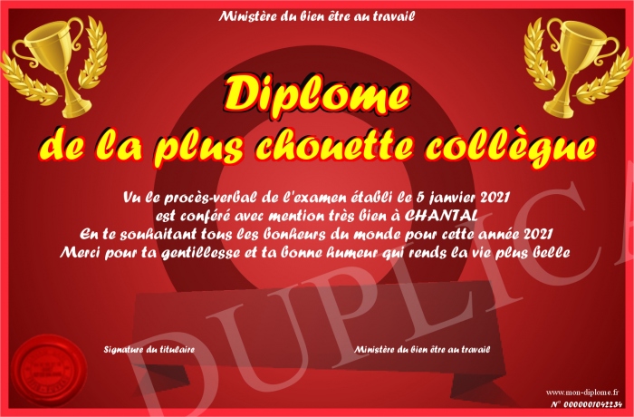 Envoyez par email votre Diplôme de la plus chouette collègue personalisé