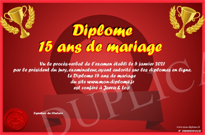 Envoyez par email votre Diplôme 15 ans de mariage personalisé