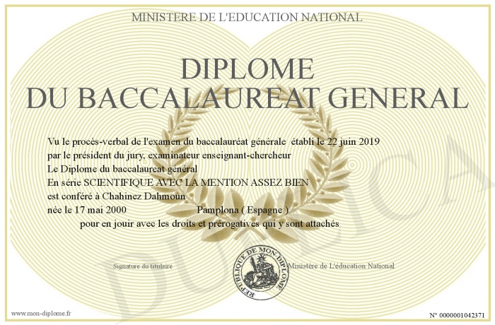 Envoyez par email votre Diplôme du baccalaureat général personalisé