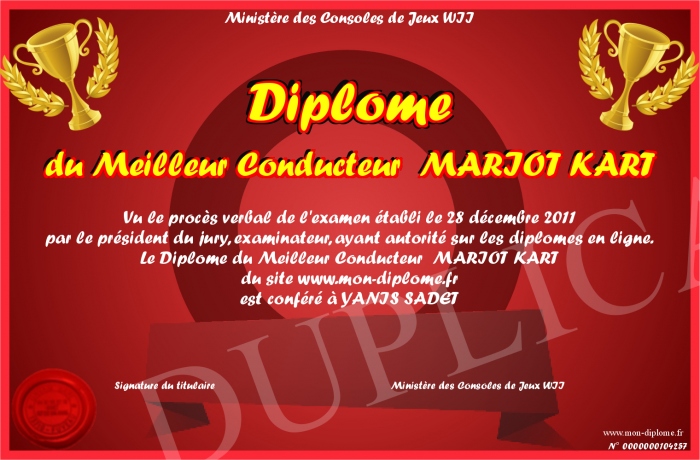 Envoyez par email votre Diplôme du Meilleur Conducteur MARIOT KART personalisé