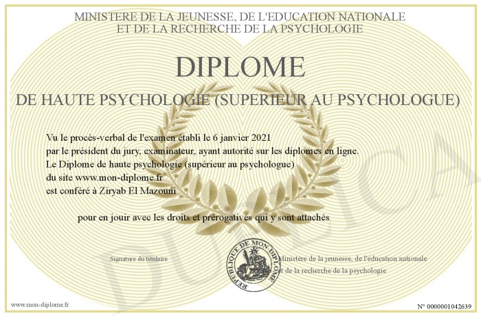 Envoyez par email votre Diplôme de haute psychologie (supérieur au psychologue) personalisé