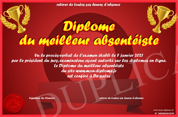 Envoyez par email votre Diplôme du meilleur absentéiste personalisé
