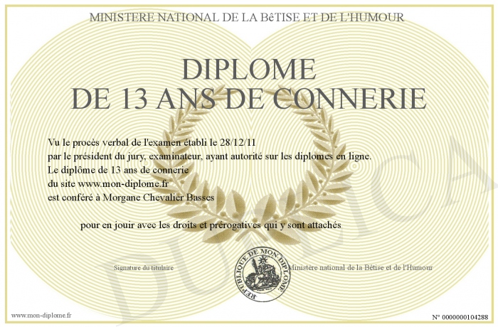 Envoyez par email votre Diplôme de 13 ans de connerie personalisé