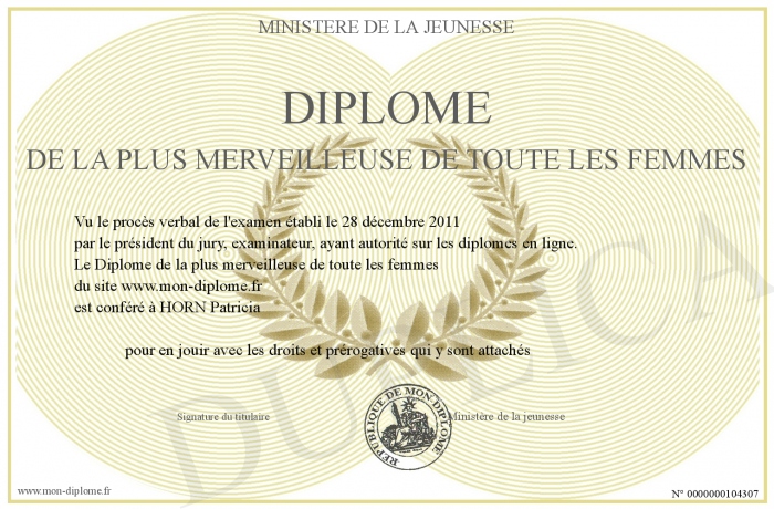 Envoyez par email votre Diplôme de la plus merveilleuse de toute les femmes personalisé