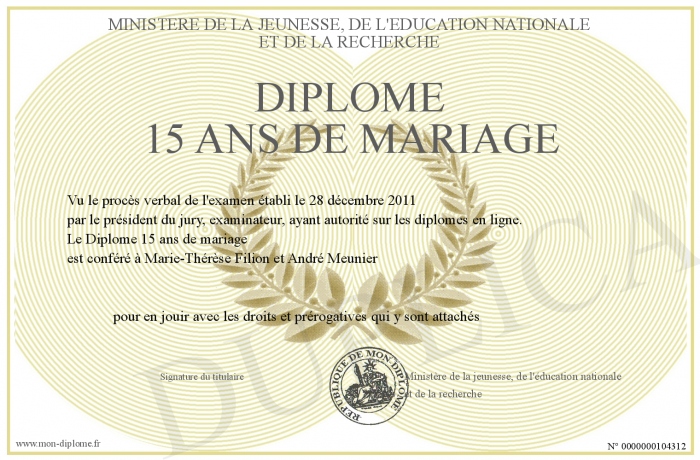 Envoyez par email votre Diplôme 15 ans de mariage personalisé