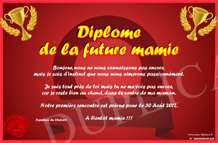 Envoyez par email votre Diplôme de la future mamie personalisé