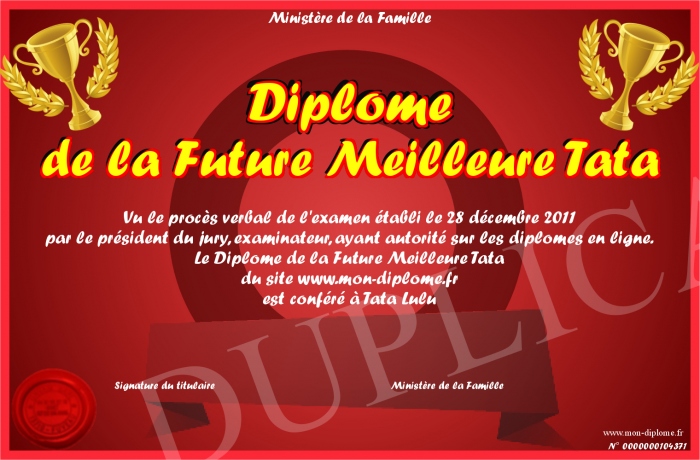 Envoyez par email votre Diplôme de la Future Meilleure Tata personalisé