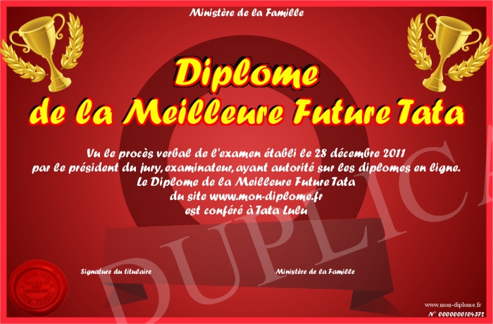 Envoyez par email votre Diplôme de la Meilleure Future Tata personalisé