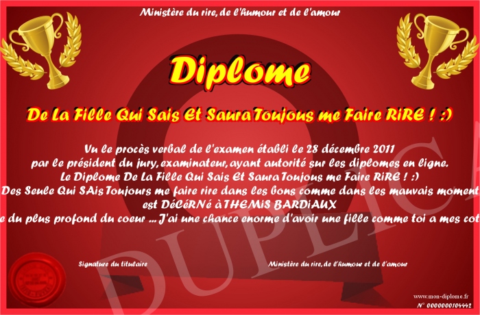 Envoyez par email votre Diplome De La Fille Qui Sais Et Saura Toujous me Faire RiRE ! :) personalisé