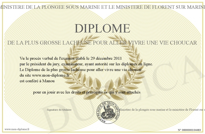 Envoyez par email votre Diplôme de la plus grosse lacheuse pour aller vivre une vie choucar personalisé