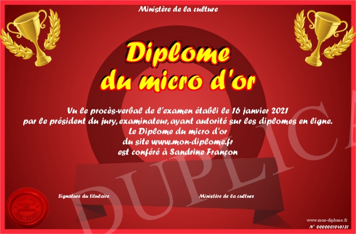 Envoyez par email votre Diplôme du micro d'or personalisé