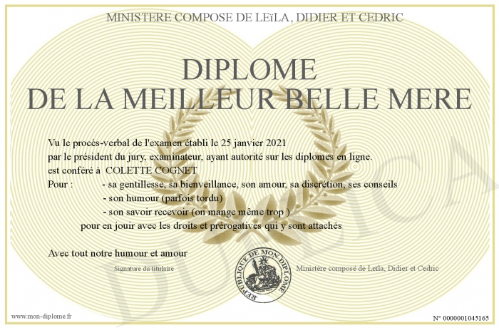 Envoyez par email votre Diplôme de la meilleur Belle Mère personalisé