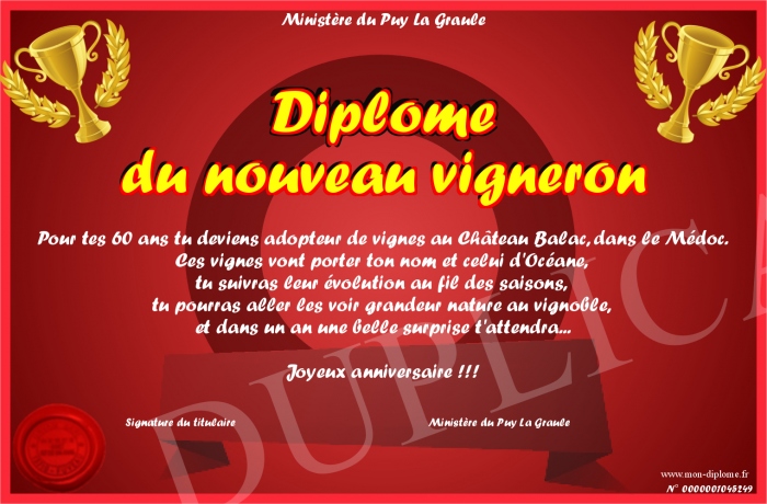 Envoyez par email votre Diplôme du nouveau vigneron personalisé