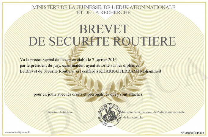 Envoyez par email votre Brevet de Sécurité Routière personalisé