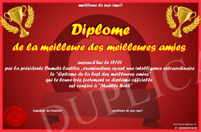 Envoyez par email votre Diplôme de la meilleure des meilleures amies personalisé