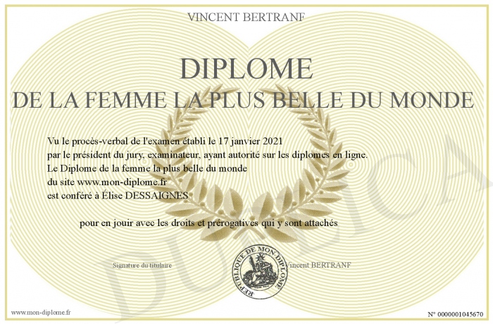Envoyez par email votre Diplôme de la femme la plus belle du monde personalisé