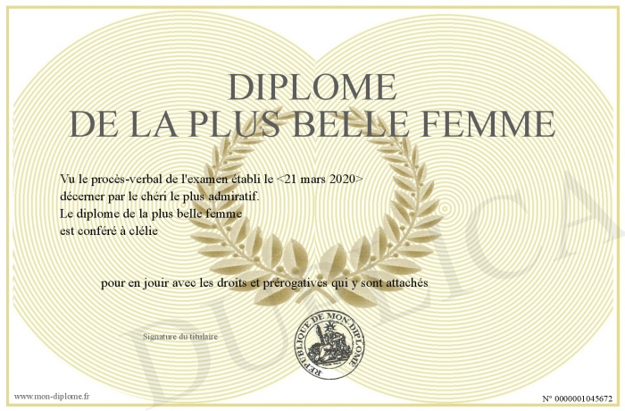 Envoyez par email votre diplôme de la plus belle femme personalisé