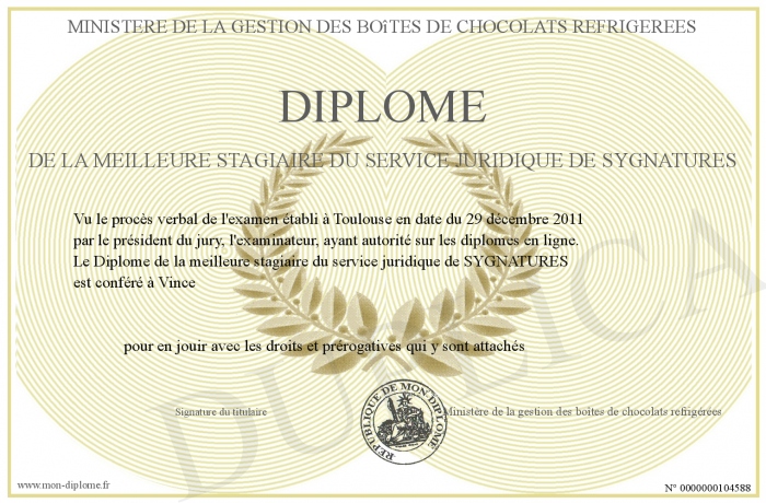 Envoyez par email votre Diplôme de la meilleure stagiaire du service juridique de SYGNATURES personalisé