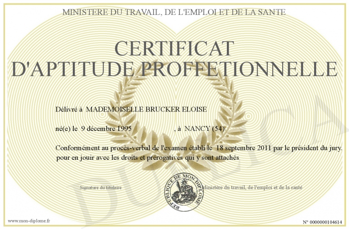 Envoyez par email votre certificat d'aptitude proffetionnelle personalisé
