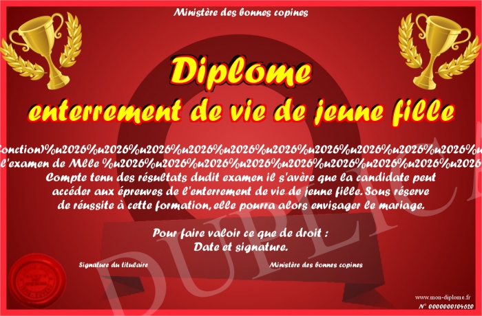 Envoyez par email votre Diplome enterrement de vie de jeune fille personalisé