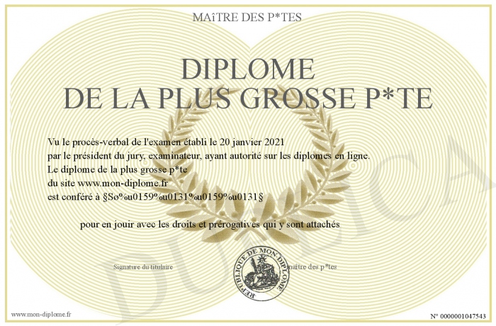 Envoyez par email votre diplôme de la plus grosse p*te personalisé