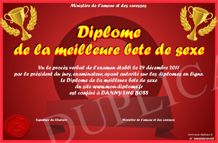 Envoyez par email votre Diplôme de la meilleure bete de sexe personalisé
