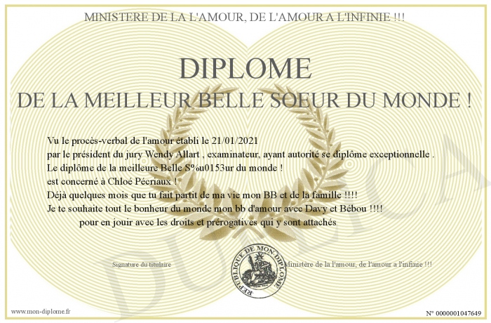Envoyez par email votre Diplôme de la meilleur belle soeur du Monde ! personalisé