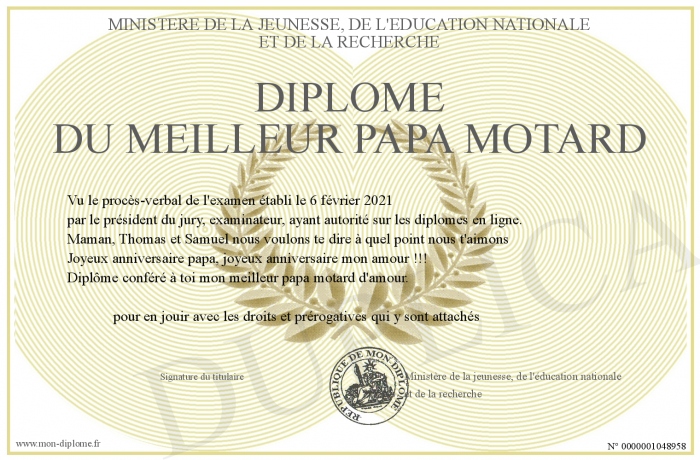 Envoyez par email votre Diplôme du meilleur papa motard personalisé
