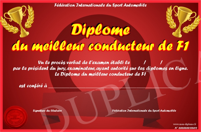 Envoyez par email votre Diplome du meilleur conducteur de F1 personalisé