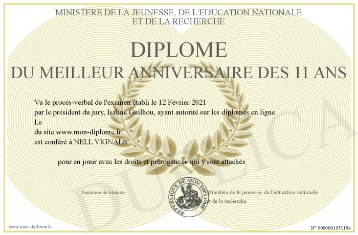 Envoyez par email votre Diplôme du meilleur anniversaire des 11 ans personalisé