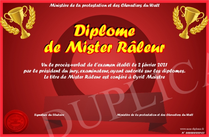 Envoyez par email votre Diplôme de Mister Râleur personalisé