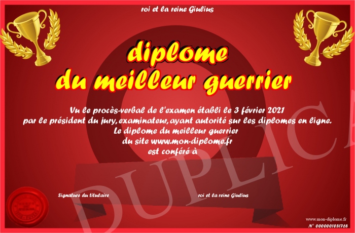 Envoyez par email votre diplôme du meilleur guerrier personalisé