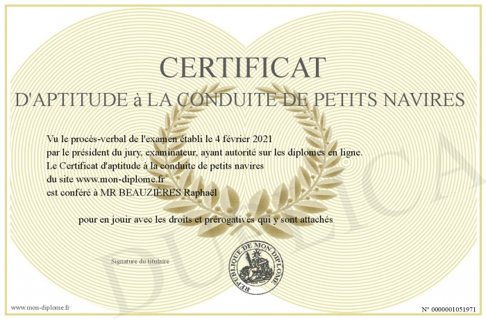 Envoyez par email votre Certificat d'aptitude à la conduite de petits navires personalisé