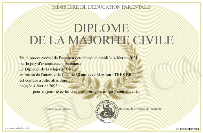 Envoyez par email votre Diplôme de la Majorité Civile personalisé