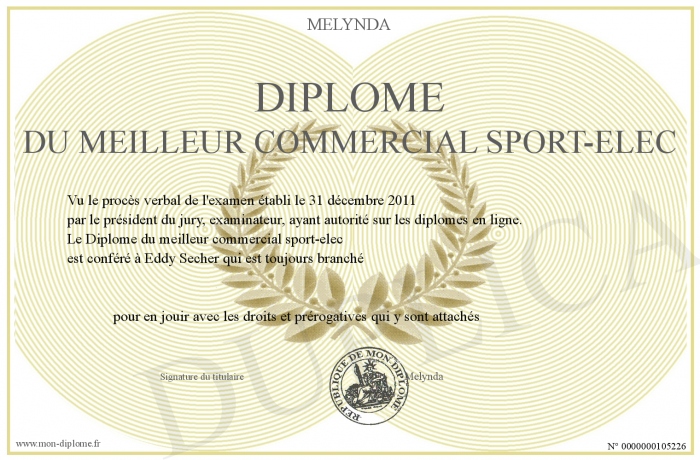 Envoyez par email votre Diplôme du meilleur commercial sport-elec personalisé