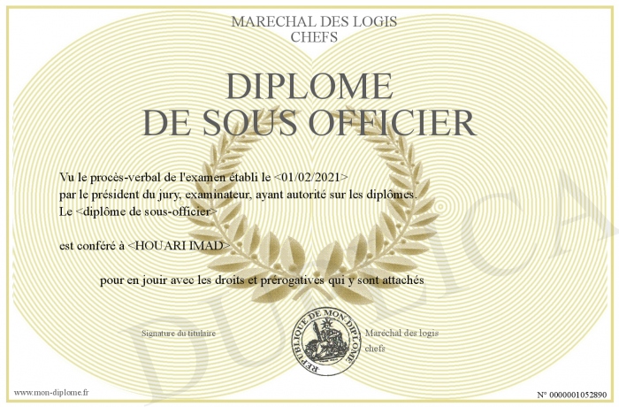 Envoyez par email votre Diplôme de sous officier personalisé