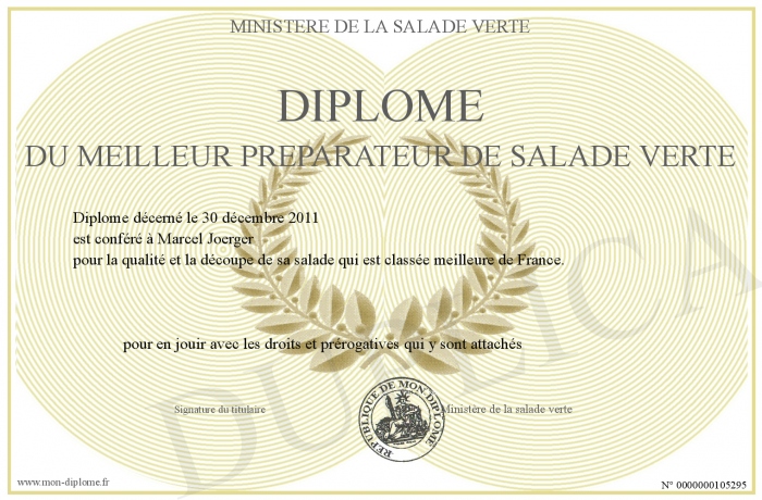 Envoyez par email votre Diplôme du meilleur préparateur de salade verte personalisé