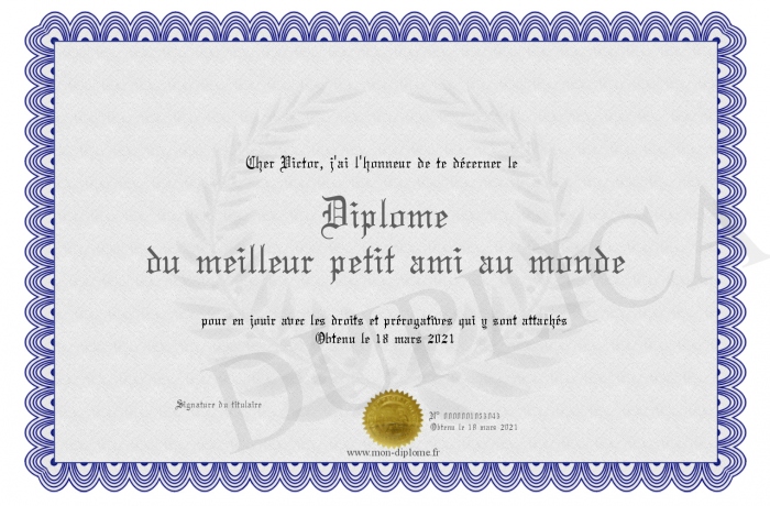 Envoyez par email votre Diplôme du meilleur petit ami au monde personalisé