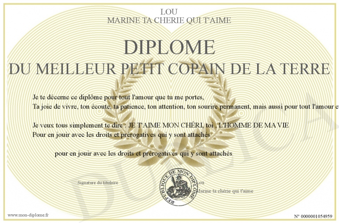 Envoyez par email votre Diplôme du meilleur petit copain de la terre personalisé
