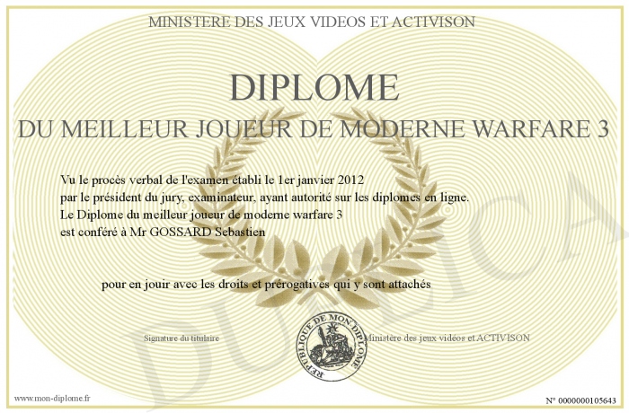 Envoyez par email votre Diplôme du meilleur joueur de moderne warfare 3 personalisé