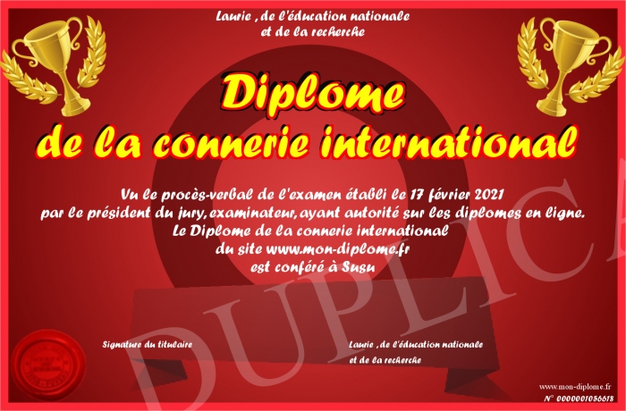 Envoyez par email votre Diplôme de la connerie international personalisé
