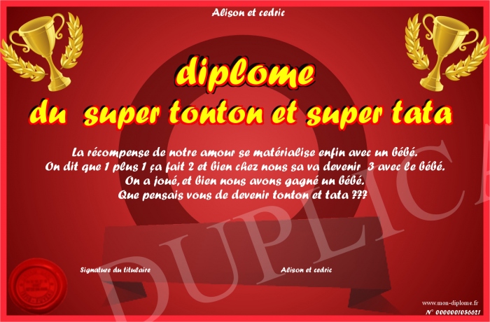Envoyez par email votre diplôme du super tonton et super tata personalisé