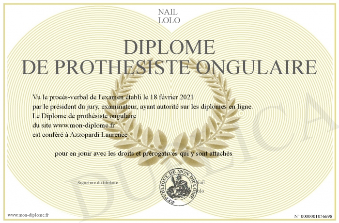 Envoyez par email votre Diplôme de prothésiste ongulaire personalisé