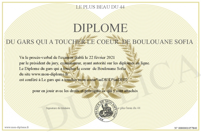 Envoyez par email votre Diplôme du gars qui a toucher le coeur de Boulouane Sofia personalisé