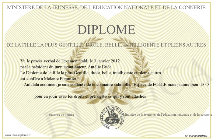 Envoyez par email votre Diplôme de la fille la plus Gentille, drôle, belle, intelligente et pleins autres personalisé