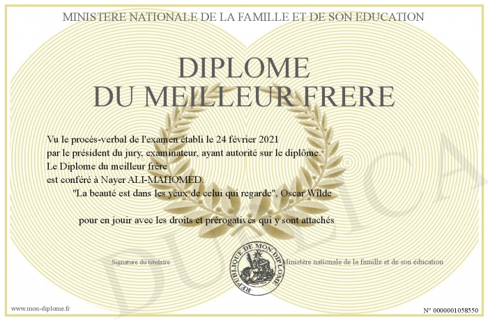 Envoyez par email votre Diplôme du meilleur frère personalisé